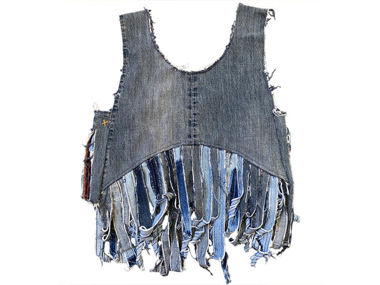 Upcycled Denim Babydoll Tank with raw deconstructed edges and fringe