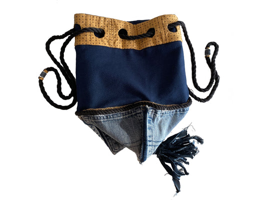 Upcycled denim pocket hobo slouch bag with Italian silk
