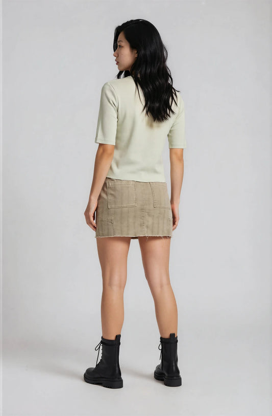 Upcycled mid rise Tan Distressed Denim Skirt with Star Patch